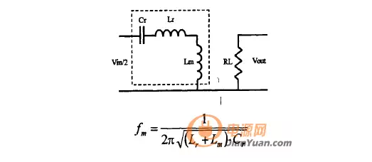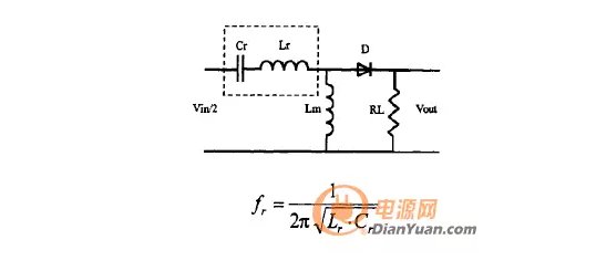 而當副邊整流二極管處于截止狀態(tài)時(shí),該結構中的變壓器與副邊斷開(kāi),此時(shí)既沒(méi)有能量從原邊傳輸到副邊,Lm不再被副邊電壓箝位,此時(shí)諧振元件為諧振電感Lr、諧振電容Cr、激磁電感Lm,定義諧振頻率為: